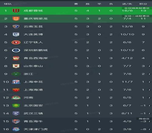 中超第5輪結束了所有比賽,最新積分榜如下!