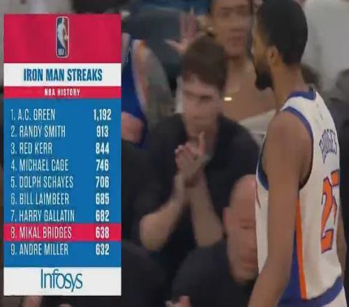 特別布里奇斯,NBA歷史級(jí)別的超級(jí)鐵人,甚至生涯至今保持全勤(8個(gè)賽季),自進(jìn)入聯(lián)盟以來(lái)已連續(xù)出戰(zhàn)638場(chǎng)常規(guī)賽。