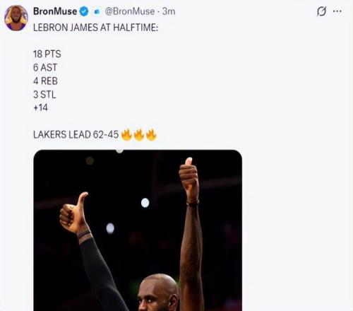 回看本場(chǎng)比賽,由于東契奇和里夫斯都因傷缺陣,開(kāi)場(chǎng)41歲的詹姆斯就開(kāi)啟進(jìn)攻模式。整個(gè)上半場(chǎng),詹姆斯出戰(zhàn)了16分33秒,投籃15中6,收下18分6助攻4籃板3搶斷。