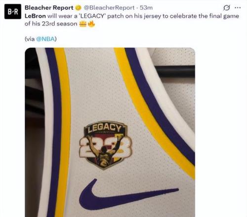 根據(jù)美媒報(bào)道,由于本賽季是詹姆斯第23個(gè)賽季的常規(guī)賽最后一戰(zhàn),在他的球衣上特意增加了一個(gè)圖案徽章,上面寫(xiě)了一個(gè)詞“Legend(傳奇)”。