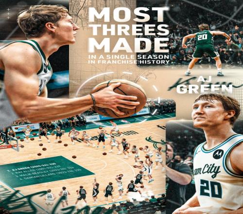 此役過后,AJ·格林本賽季三分命中數(shù)定格在232記,超越雷·阿倫(00-01賽季/229記)升至雄鹿隊(duì)史單賽季三分命中數(shù)第一。