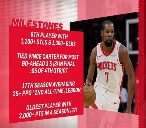 KD本季里程碑:歷史最老單季2000分先生生涯17次單季25+僅次老詹