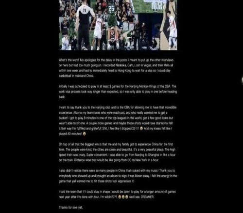 J.Cole解釋,他原計(jì)劃參加至少三場(chǎng)CBA比賽,然而,工作簽證的辦理過程比預(yù)期要長(zhǎng)得多,J.Cole透露自己一周內(nèi)錄制了多個(gè)訪談內(nèi)容,然后就必須赴香港等待簽證。“要感謝我的隊(duì)友們,他們表現(xiàn)得非???,并且真心希望我能投進(jìn)一個(gè)球!我得以在世界頂級(jí)聯(lián)賽之一的比賽中上場(chǎng)8分鐘,雖然有幾次不錯(cuò)的出手機(jī)會(huì),但未能命中。如果再打幾場(chǎng)比賽,或許那些投籃就能逐漸變得手到擒來了!”J.Cole表示CBA聯(lián)賽是世界頂級(jí)聯(lián)賽,以及他自己覺得好像得了20分一樣。J.Cole在上一輪南京不敵廣州的比賽出場(chǎng)8分鐘04秒,5次出手沒有命中,他的CBA數(shù)據(jù)定格在1個(gè)籃板1次助攻1次犯規(guī)。真沒想到,就這么結(jié)束了…
