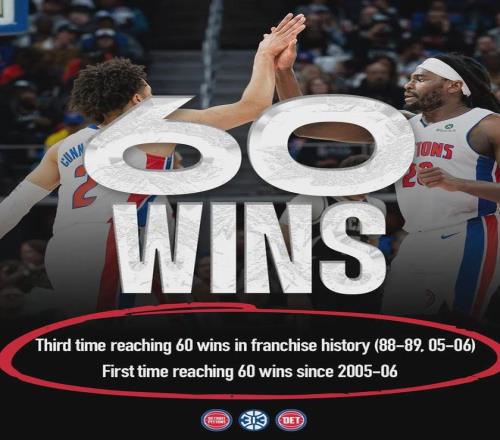 活塞上一次拿到60勝,還要追溯到2005-06賽季,距今整整20年。當(dāng)時(shí)活塞一路打到東決,最后被熱火4-2淘汰?;钊?duì)史一共3次斬獲60勝:1988-89賽季(63勝19負(fù)),2005-06賽季(64勝18負(fù)),2025-26賽季(60勝22負(fù))。