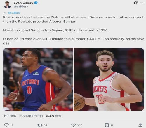 據(jù)福布斯體育記者Evan Sidery報(bào)道,活塞內(nèi)線杰倫-杜倫在今夏有望獲得5年超過2億美元的新合同,均薪達(dá)到4000萬美元以上。Evan Sidery表示,聯(lián)盟普遍認(rèn)為,活塞給杜倫的合同會(huì)高于2024年火箭給申京的合同(5年1.85億)。