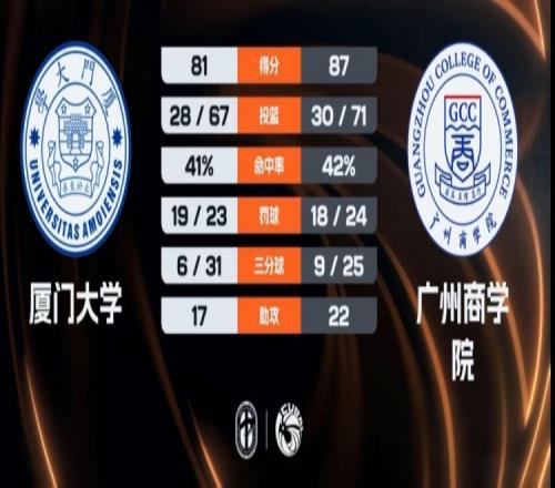 第四節(jié),雙方圍繞兩位數(shù)的分差展開激烈爭奪,孫文俊連投帶罰拿分,鄭博文火力全開,里突外投連得9分強(qiáng)勢(shì)回應(yīng),曹梓烽三分穩(wěn)住局勢(shì),廈門大學(xué)奮力反擊縮小分差,無奈時(shí)間所剩無幾。最終,廣州商學(xué)院87-81力克廈門大學(xué)。