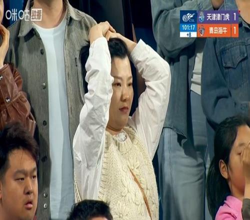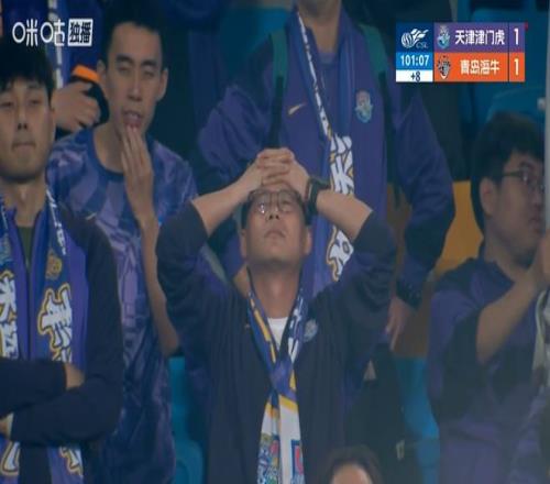 再看天津津門虎主帥于根偉,先是愣在原地,緩了好一會才匆匆向球迷擺手示意(下圖)似乎在為球隊的錯失3分而致歉。