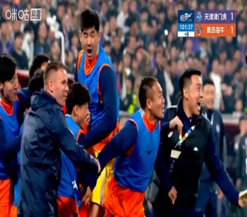 鏡頭又是一轉(zhuǎn),給到了客隊青島海牛的替補席。這里仿佛成了歡樂的花園,球員和教練正在歇斯底里般慶祝著球隊的絕處逢生,這喜從天降的歡樂場面猶如奪冠(下圖)。
