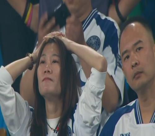 鏡頭又聚集到主隊球迷看臺,一片鴉雀無聲之中,不少球迷紛紛抱頭作不可思議狀,更有女球迷偷偷抹去眼角的淚水(下圖)。