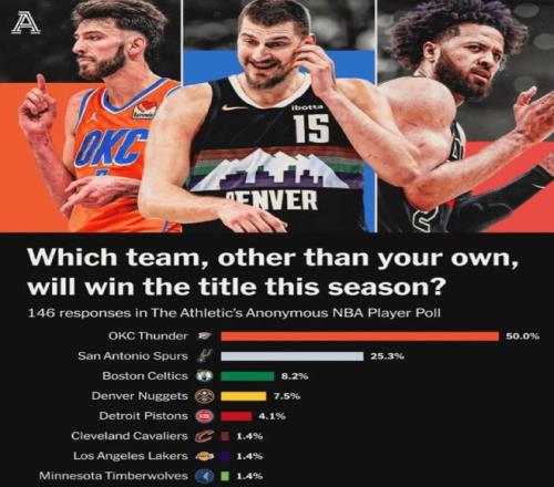 4月13日,NBA常規(guī)賽落幕,美國(guó)知名媒體《The Athletic》發(fā)布一項(xiàng)球員匿名調(diào)查,問(wèn)題為:“除了自己球隊(duì),你認(rèn)為哪支球隊(duì)能奪冠?”,結(jié)果在146份調(diào)查中,雷霆被50%的球員認(rèn)為能奪冠,遠(yuǎn)遠(yuǎn)領(lǐng)先第二名馬刺的25.3%。