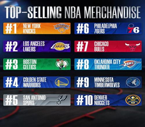 NBA本賽季球隊(duì)球衣銷量榜:尼克斯居首,湖凱二三,勇士第四