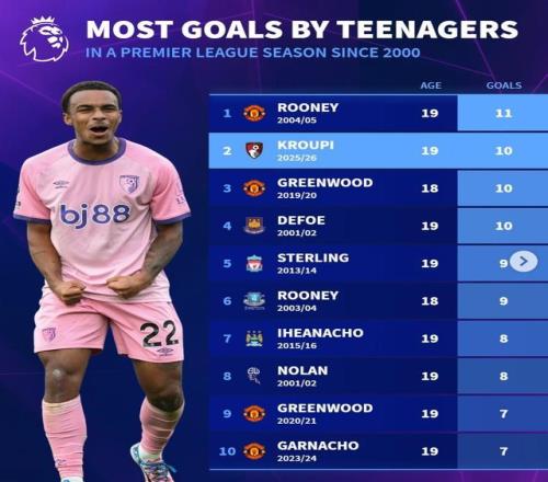 北京時(shí)間4月13日,在克魯皮用進(jìn)球幫助伯恩茅斯本輪英超客場(chǎng)2-1爆冷擊敗領(lǐng)頭羊阿森納之后,來(lái)自德轉(zhuǎn)的統(tǒng)計(jì)指出,這位現(xiàn)年19歲的法國(guó)新星有望打破由魯尼保持的英超自2000年以來(lái)U20球員單賽季的進(jìn)球數(shù)紀(jì)錄。