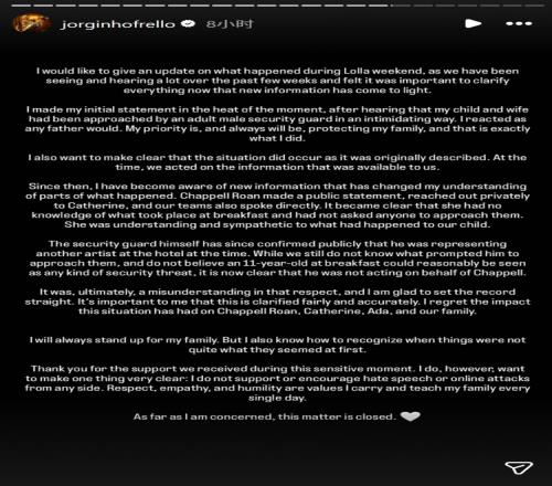 歸根結(jié)底,在這方面是一個誤會,我很高興現(xiàn)在能把事實澄清。我非常重視以公平和準(zhǔn)確的方式說明這件事。我對這件事情給查普爾·羅恩以及我們家庭帶來的影響感到遺憾。我永遠(yuǎn)會站出來保護(hù)我的家人。但我也知道如何識別事情并非表面看起來那樣。