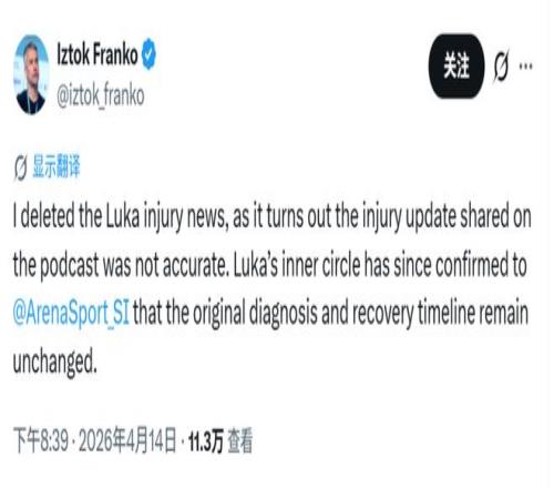 北京時(shí)間4月14日,有報(bào)道稱湖人球星東契奇在西班牙接受的檢查結(jié)果顯示,他的腿筋拉傷傷勢(shì)比最初診斷的更為嚴(yán)重。記者Iztok Franko先是轉(zhuǎn)發(fā),隨后更正消息:“我已經(jīng)刪除了有關(guān)東契奇受傷的相關(guān)消息,原因是那檔播客節(jié)目中披露的傷情更新并不準(zhǔn)確。東契奇陣營(yíng)已向《體育畫報(bào)》ArenaSport 欄目證實(shí),他最初的診斷結(jié)果與康復(fù)時(shí)間表均未發(fā)生變化。”
