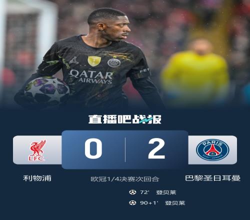體育播報(bào)4月15日宣 北京時(shí)間4月15日凌晨3時(shí),歐冠四分之一決賽次回合,利物浦坐鎮(zhèn)安菲爾德球場(chǎng)迎戰(zhàn)巴黎。上半場(chǎng)雙方均無(wú)建樹(shù),登貝萊錯(cuò)失一次破門(mén)良機(jī),?;倏藷o(wú)對(duì)抗情況下受傷離場(chǎng),隨后門(mén)德斯也因傷被替換下場(chǎng)。巴黎半場(chǎng)0-0戰(zhàn)平利物浦。下半場(chǎng),杜埃因傷下場(chǎng),麥卡利斯特曾制造了一次點(diǎn)球機(jī)會(huì),但是被VAR取消,隨后登貝萊上演梅開(kāi)二度。最終巴黎2-0擊敗利物浦,以兩回合總比分4-0淘汰利物浦挺進(jìn)四強(qiáng),將對(duì)陣拜仁和皇馬之間的勝者。