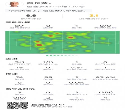 奧爾莫本場(chǎng)數(shù)據(jù):1次助攻,3射1正,1次錯(cuò)失良機(jī),2次關(guān)鍵傳球