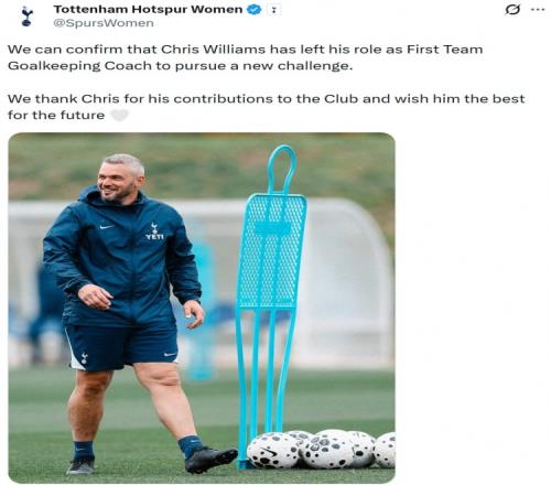 熱刺女足官方:一線隊(duì)守門(mén)員教練克里斯威廉姆斯離職