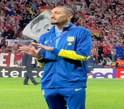 比賽結(jié)束后,因傷無法出戰(zhàn)的拉菲尼亞,走向客隊看臺,向遠(yuǎn)征而來的巴薩球迷致意,但就在這時,來自主場的噓聲如潮水般襲來。面對馬德里競技球迷的嘲諷,這位巴西邊鋒沒有選擇沉默,而是露出一個意味深長的微笑,并做出一個帶有挑釁意味的手勢。