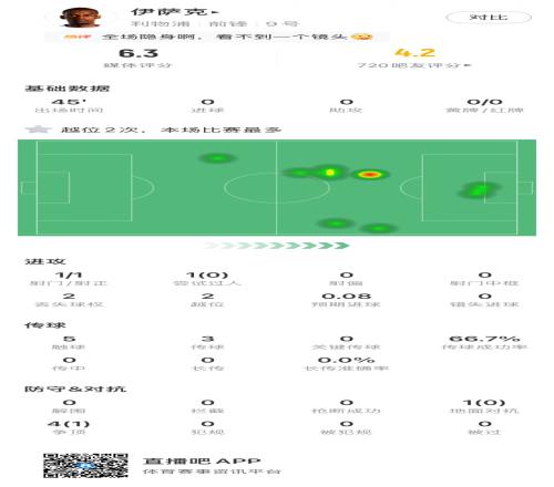 伊薩克在45分鐘內(nèi)僅有5次觸球,中場(chǎng)休息時(shí)被加克波換下。
