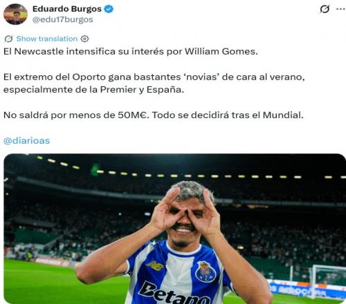 記者:紐卡有意波爾圖邊鋒威廉戈麥斯,轉(zhuǎn)會費預(yù)計超5000萬歐