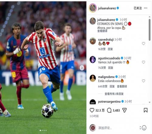 阿爾瓦雷斯社媒曬出比賽照片,慶祝球隊晉級,配文:“我們晉級歐冠半決賽,現在要沖擊國王杯冠軍!”