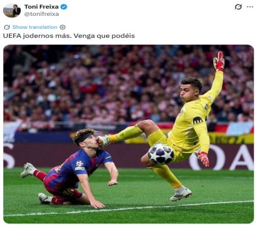 體育播報(bào)4月15日宣 在歐冠1/4決賽次回合,巴薩2-1擊敗馬競(jìng),總比分2-3被淘汰。前巴薩高管Toni Freixa也在個(gè)人社媒談到雙方兩回合較量。
