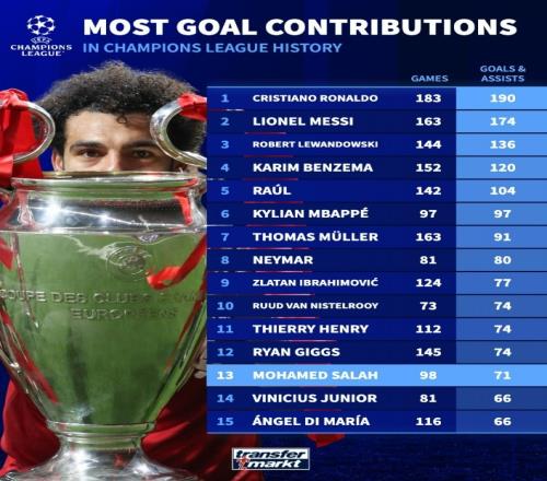 體育播報(bào)4月15日宣 在歐冠淘汰賽次回合,利物浦0-2不敵巴黎。本場(chǎng)比賽薩拉赫替補(bǔ)登場(chǎng)沒有參與進(jìn)球,這也是他利物浦生涯歐冠最后一戰(zhàn)。德轉(zhuǎn)盤點(diǎn)了歐冠歷史參與進(jìn)球榜,其中薩拉赫位列第13位,具體如下(進(jìn)球+助攻):