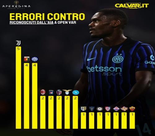 本賽季意甲出現(xiàn)VAR不利判罰次數(shù)榜:尤文5次居首,國(guó)米4次第二