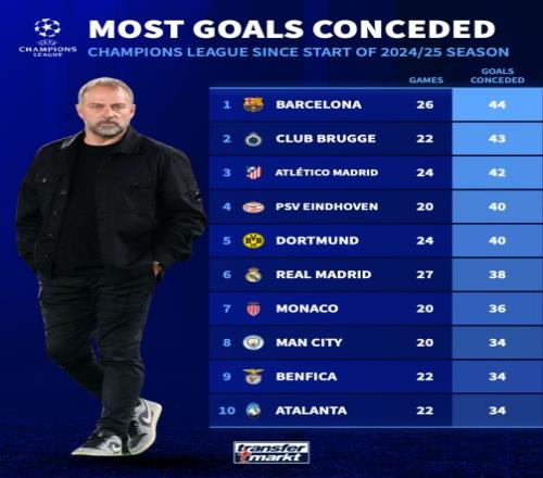 問題是巴薩丟球也多,過去兩個(gè)賽季他們?cè)跉W冠丟了44球,是所有球隊(duì)里最多的。只有布魯日(43球)和今晚的對(duì)手馬競(jìng)(42球)接近這個(gè)數(shù)字。