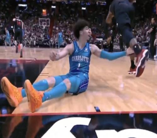 值得一提的是,去年10月28日黃蜂客場117-144不敵熱火的比賽中,三球在倒地后也曾抓過阿德巴約小腿。