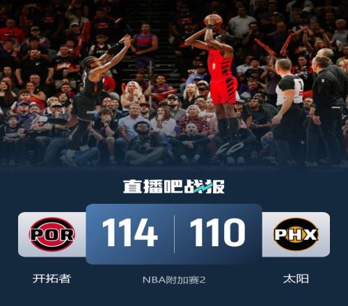比賽開始,太陽率先發(fā)力,連投帶罰打出14-7的開局,此后開拓者奮力反擊,連中3記三分迅速迫近比分,次節(jié)太陽突然熄火,開拓者萬箭齊發(fā)轟出24-8的進(jìn)攻狂潮取得兩位數(shù)領(lǐng)先,杰倫·格林連續(xù)中投止血,太陽外線開火連中三分,半場戰(zhàn)罷開拓者65-62領(lǐng)先太陽。易邊再戰(zhàn),布克累計(jì)4犯被迫下場,開拓者趁勢打出10-2的攻擊波再獲兩位數(shù)優(yōu)勢,吉萊斯皮三分止血,太陽多點(diǎn)開花不斷迫近比分,末節(jié)太陽越戰(zhàn)越勇,打出11-2的攻擊波反超10分,開拓者連中三分,雙方爭奪陷入白熱化,關(guān)鍵時(shí)刻格蘭特連中三分,布克罰中兩分后阿夫迪亞和古德溫各中一球,阿夫迪亞關(guān)鍵2+1,杰倫·格林反絕殺失手。最終,開拓者114-110險(xiǎn)勝太陽,鎖定西部第7。