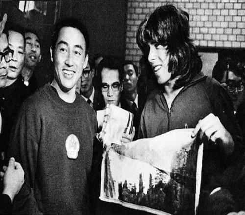 1971年4月,日本名古屋,中國(guó)乒乓球隊(duì)的運(yùn)動(dòng)員莊則棟(左)將一塊杭州織錦工藝品贈(zèng)送給美國(guó)乒乓球隊(duì)的運(yùn)動(dòng)員格倫·科恩(右)