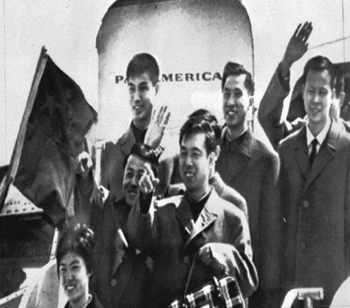 1972年4月13日,中國(guó)乒乓球代表團(tuán)飛抵底特律,對(duì)美國(guó)進(jìn)行回訪。新華社 圖