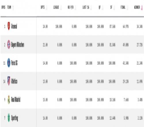 歐冠奪冠概率:阿森納34%居首,拜仁巴黎馬競分列24,皇馬僅3%