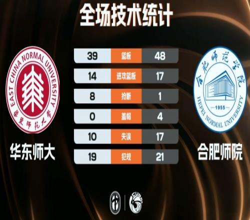 末節(jié)決勝雙方交替拿分都占不到便宜,蔡兆弘和李殷勤開局進球幫助合肥師院取得久違的領(lǐng)先,華東師大則依靠李奕男和劉子涵的三分迅速穩(wěn)住局面。最后時刻劉子涵再度打進關(guān)鍵進球,合肥師院雖然讀秒階段由陳利偉命中三分但為時已晚。最終,華東師范大學(xué)87-80力克合肥師院拿下比賽。