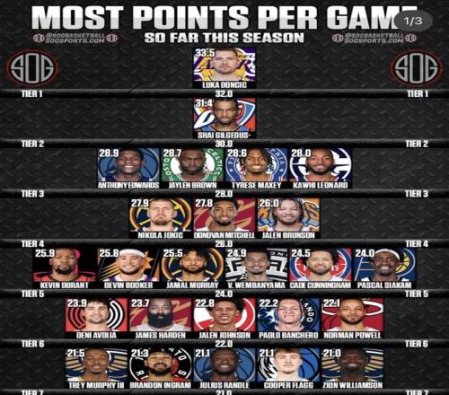 這份《本賽季至今場均得分分檔榜》真正有意思的地方,根本不是誰排第一誰排第二,而是它把本賽季這幫得分手的“階層”切得極其生硬、甚至可以說是殘暴。東契奇場均33.5分獨居第1檔,亞歷山大31.4分霸占第2檔。從第3檔開始,分?jǐn)?shù)直接暴跌到28分上下:愛德華茲28.9分,布朗28.7分,馬克西28.6分,萊昂納德28.0分。再往下看,第4檔是約基奇27.9分、米切爾27.8分和布倫森的26.0分。到了第5檔,杜蘭特25.9分、布克25.8分、穆雷25.5分、文班亞馬24.9分全都擠在一塊兒。你看懂了嗎?這根本不是平滑過渡,而是33分、31分、28分、26分、24分這樣階梯式往下砸,斷層感強(qiáng)得讓人倒吸一口涼氣。