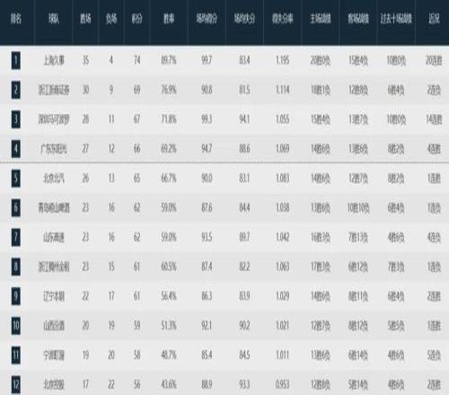 目前廣東隊(duì)以27勝12負(fù)戰(zhàn)績(jī)排名聯(lián)盟第四,北京隊(duì)26勝13負(fù)第五緊隨其后,前三名分別為上海隊(duì)(35-4)、衛(wèi)冕冠軍廣廈隊(duì)(30-9)和深圳隊(duì)(28-11)。
