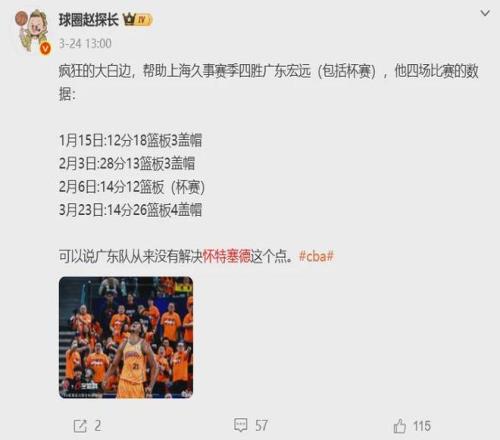 過(guò)去四場(chǎng)白邊對(duì)陣廣東隊(duì)的比賽,都在禁區(qū)展現(xiàn)出了無(wú)比強(qiáng)悍的統(tǒng)治力,具體如下: