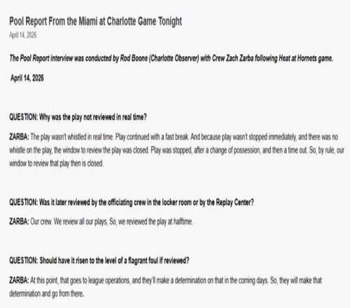 北京時間4月15日,黃蜂記者羅德-布恩在熱火對陣黃蜂賽后對裁判組負(fù)責(zé)人扎爾巴進(jìn)行采訪,詢問比賽中相關(guān)的爭議回合。這個回合出現(xiàn)在第二節(jié),當(dāng)時拉梅洛-鮑爾(三球)拉到阿德巴約的腳踝,造成阿德巴約腰部受傷離場。裁判當(dāng)時沒有任何判罰,也沒有回看。扎爾巴回應(yīng)了相關(guān)的話題——