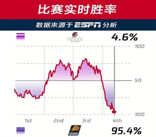 轉播方公布了比賽實時勝率,可以出,ESPN認為開拓者勝率只有4.6%,而太陽勝率為95.4%,原因也很簡單,首先賽前ESPN就不認為開拓者能贏,雖然比賽過程中開拓者長時間保持領先,但最終在第四節(jié)被太陽全面反超。