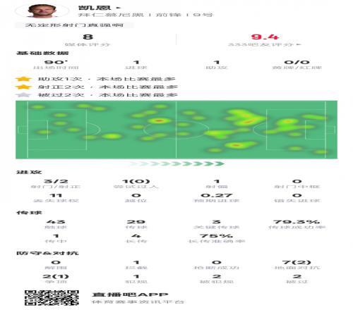 凱恩本場(chǎng)比賽數(shù)據(jù)如下: