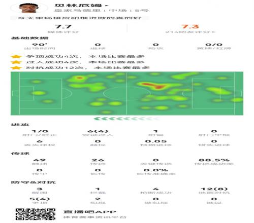 貝林厄姆本場1射+0關(guān)鍵傳球3解圍4搶斷+17對抗12成功獲評7.7分