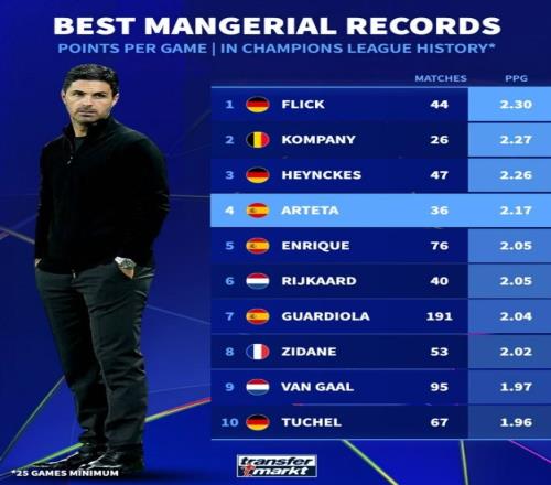 歐冠歷史主帥場均積分榜:弗里克居首,孔帕尼次席,阿爾特塔第四
