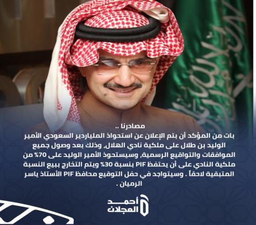體育播報(bào)4月15日宣 據(jù)記者Ahmed Al-Ajlan報(bào)道,沙特阿爾瓦利德·本-塔拉勒親王將收購利雅得新月70%股份。