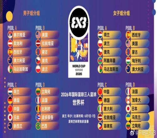 2026三人籃球世界杯男女籃分組官宣!中國男籃女籃均被分到C組! 微博 2026-04-16 09:46:30 體育播報4月15日宣 國際籃聯(lián)公布了2026年三人籃球世界杯的分組情況,中國男籃女籃均被分到C組。中國男籃的同組對手包括:荷蘭、德國、日本、新西蘭。中國女籃的同組對手包括:德國、意大利、拉脫維亞、菲律賓。本屆三人籃球男女籃世界杯將于6月在波蘭進行。 籃球開拓者中國籃球三人籃球中國隊 上一篇: 華南理工5人13+輕取上海體大王子鑒19+7王樹宇20分下一篇: 返回列表