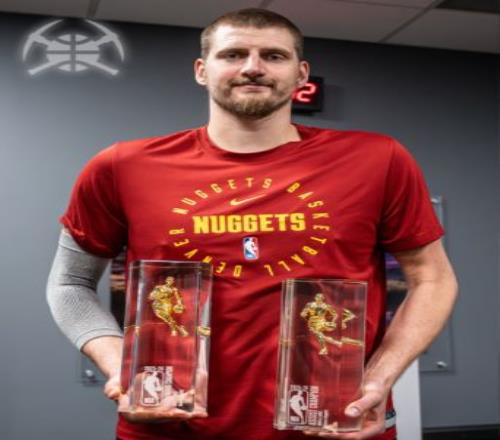 丹佛球館今天有個奇怪的畫面:NBA歷史第一人同時抱著籃板王和助攻王獎杯,而他兩歲的女兒Ognjena正試圖把其中一個搶走。