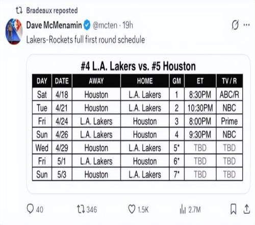 火箭VS湖人的賽程已經(jīng)全部出爐,4月18日開啟第一場,4月21日第二場,4月24日第三場,第四場4月26日,第五場4月29日,第六場5月1日,第七場5月3日。