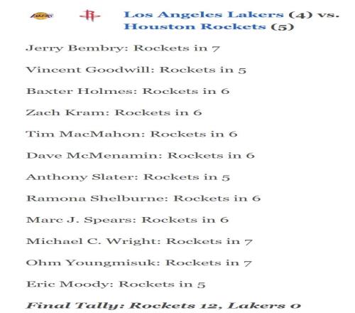 在4月14日季后賽對陣出爐時,就有數(shù)據(jù)媒體預(yù)測火箭淘汰湖人的概率超過80%,而在ESPN12位專家的預(yù)測中全都看好火箭晉級:三人看好4-1,六人看好4-2,三人看好4-3。