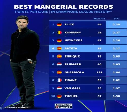 阿爾特塔以場均2.17分排在歷史第四,他一共執(zhí)教了36場歐冠,戰(zhàn)績?yōu)?4勝6平6負。他執(zhí)教的第一場歐冠是2023年對陣朗斯。