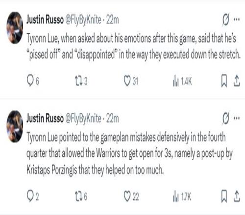 泰倫盧在采訪中談到這場比賽,他表示:氣死我了,這場比賽本來被我們牢牢控制著,我們發(fā)生了很多愚蠢的失誤與低級的執(zhí)行。比賽還剩10分鐘我們曾領(lǐng)先13分,我對球隊的表現(xiàn)感到失望。